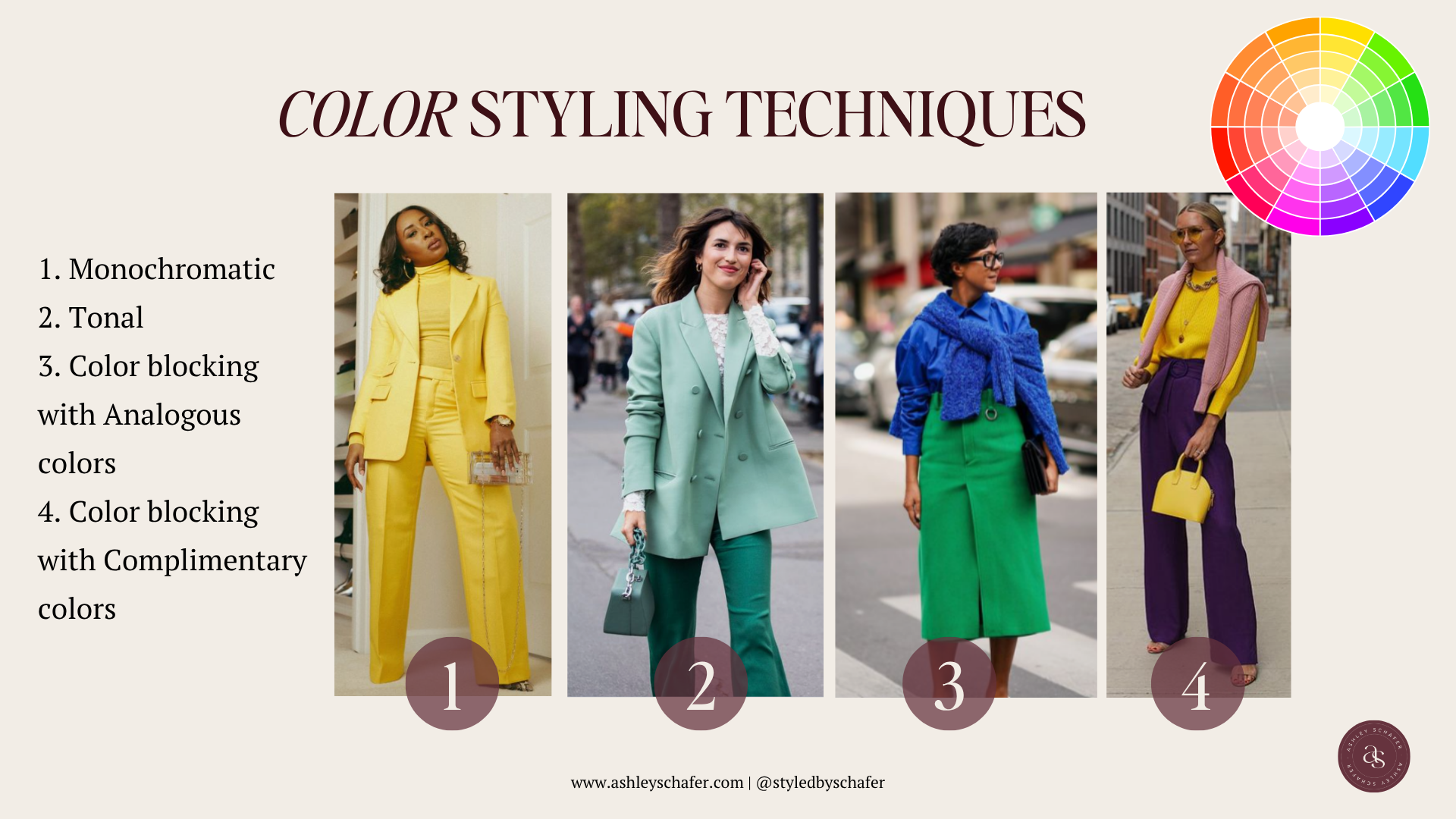 4. Color blocking with complimentary colors - Pairing colors opposite each other on the color wheel. This is the most bold of the styling techniques. Think pairing orange and purple or green and red together.