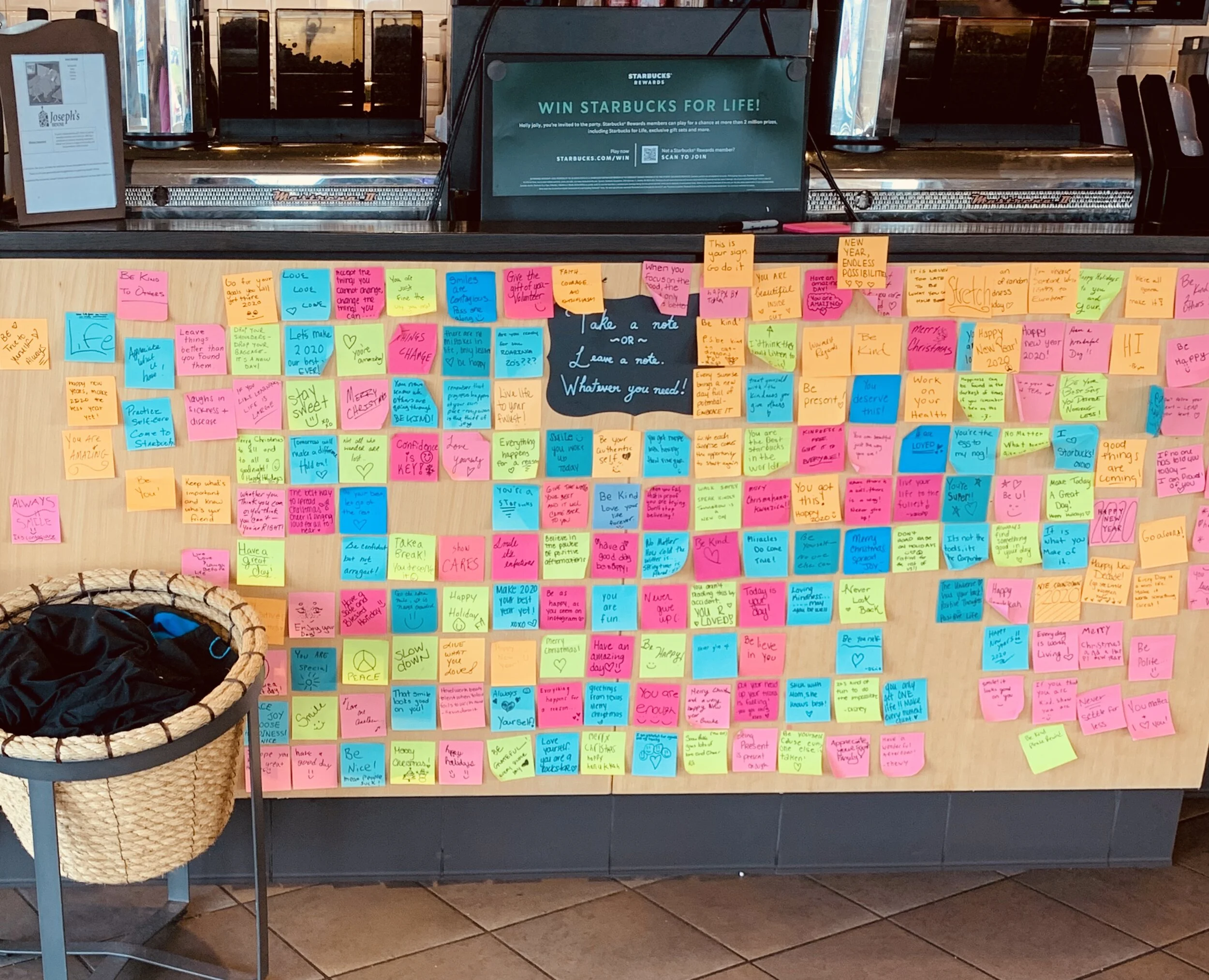 I’ve thought about this post for a few days now, and unfortunately I’ve just written myself in circles. It should be inspirational, right? Motivational? Probably. But how many times can we read “New Year, New You” before we get numb to it? Today, by chance the sandwich shop I often work from was closed, so I’ve set up shop down the street at Starbucks. So picture it with me- me sitting at a high top, smelling the strong aroma of coffee, staring into space about what to talk to you all about. It should be relevant, real, honest and maybe even funny. I’ve got nothing. And then, I look to my left. They have a whole sticky note wall of motivational quotes written by customers. Its so beautiful seeing all of the different handwriting and motivating words. For whatever reason, this wall of thoughtful mantras seemed to pack more of a punch for me seeing it written. It was like seeing it in someone’s own handwriting made it feel more genuine.