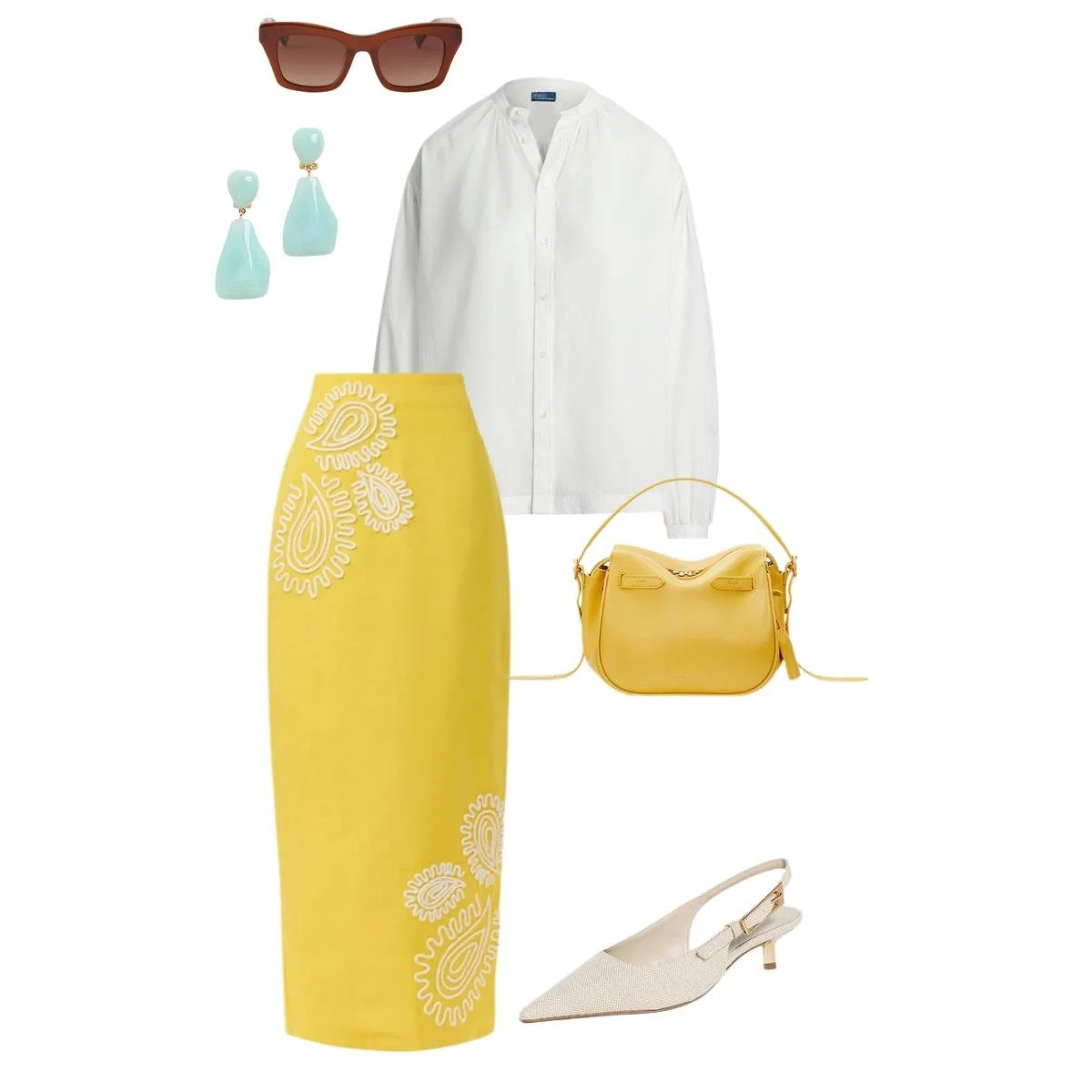 Shop key pieces and supplement with your wardrobe where you see fit. For example, with the look shown below, if you already have a quality white button down, even a white tee and a pair of nude pumps, you can easily recreate this look with only purchasing the skirt and maybe accessories!