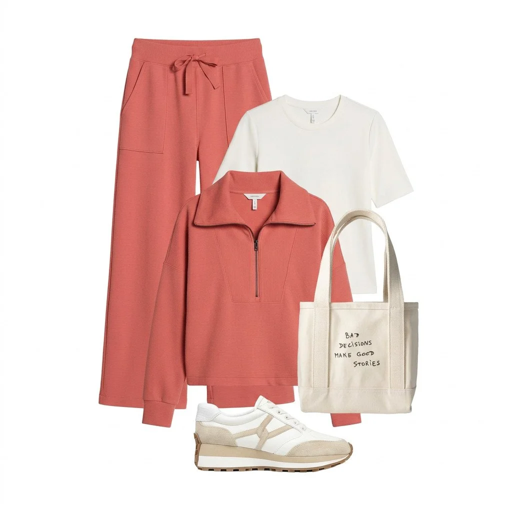 Upgrade your base layers. A matching set and a structured tee goes a long way here. Mix in pieces like sweaters or an oversized button down with your athleisure to make your look feel thought out and intentional.