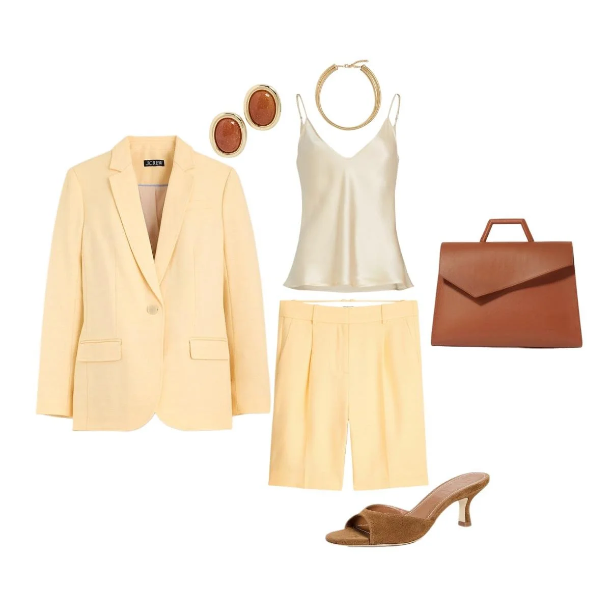 Inseam matters. If you're trying to wear a short suit to a work event or to the office (dress code permitting!) opt for a longer, bermuda style short. Bermuda shorts are trending this season and the key to pulling them off is all in the fit and styling. They shouldn't be tight to your leg as knee length shorts were from seasons ago, but more relaxed like a trouser. I like to style them with a feminine shoe to balance the masculine feel of the short. I love when a blazer and the shorts are the same length for a night out. It has a sexy yet conservative feel. The length of the blazer and sleeve coverage helps to balance the amount of leg shown.