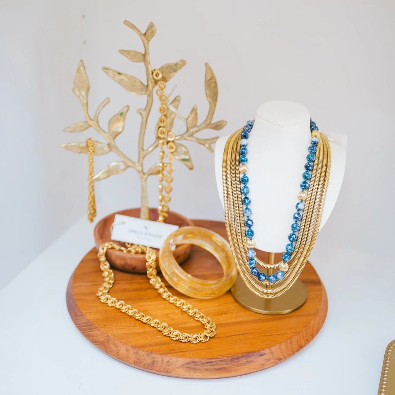 A collection of finely curated vintage jewelry available for clients to shop during their try-on session.